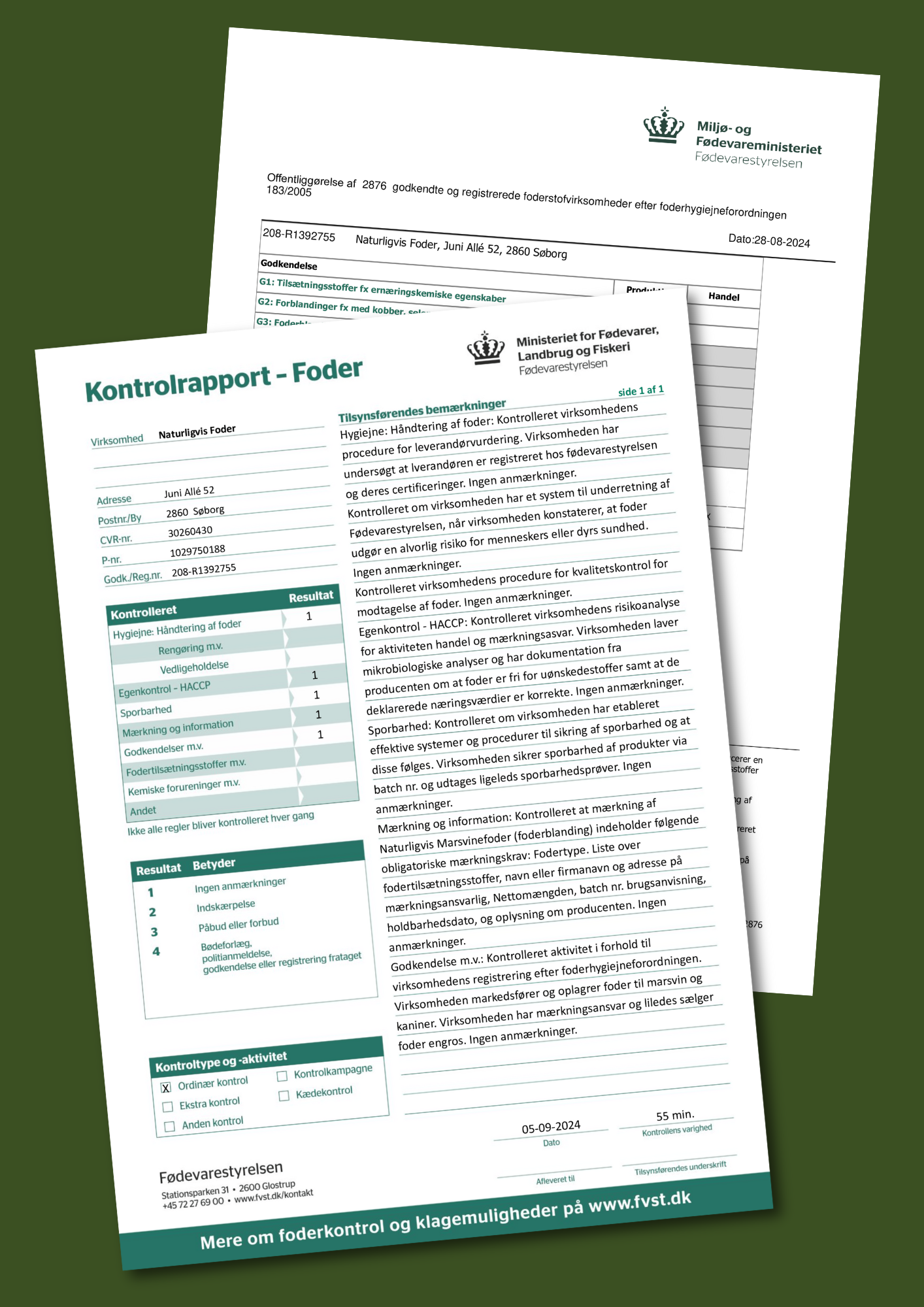 Naturligvis Foder er et 100% danskejet familiefirma og er registreret som fodervirksomhed jf. foderhygiejneforordningen hos Fødevarestyrelsen. Fødevarestyrelsen kommer på kontrol minimum én gang om året for at sikre at alle processer og lovgivning efterleves.